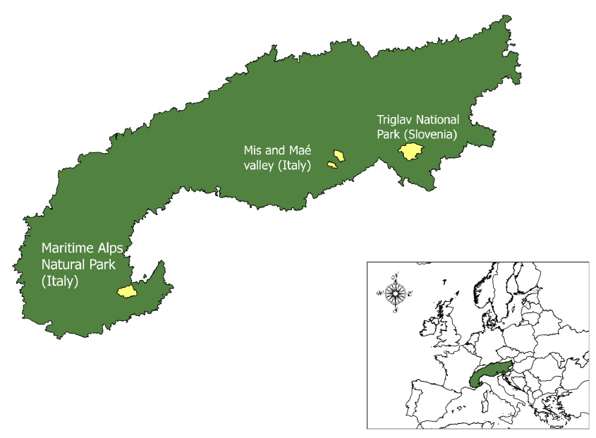 Gesso-Vermenagna valley is located in the north-western part of Italy (Piedmont Region), close to the French border. The study area includes seven municipalities. The land area is approximately 51,500 ha of which about 32,000 ha are located in protected areas (Maritime Alps Natural Park or Nature2000 sites). The main land uses are forests (42%) and pastures (33%).