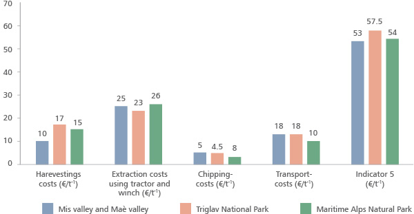 Finally, the results of the fourth indicator (I4) are reported in Figure 2. The costs collected in the case studies are higher than the data from literature: according to Asikainen et al. [51] in Eastern Europe the harvesting, extraction, chipping and transport costs of logging residues vary between 20-25 €∙m-3, while in Western Europe these costs vary between 30-35 €∙m-3. These differences are due to the higher labour and fuel costs in Western European countries. In Veneto region (Mis and Maè valleys) the total costs (harvesting, extraction, chipping and transport costs) has been estimated at around 53 €∙t-1 fresh wood chips and this value is comparable with the value reported in local literature 65 €∙t-1 fresh wood chips [52]. The Triglav National Park case study shows costs slightly higher for harvesting (17 €∙t-1 fresh chips), while the Gesso-Vermenagna valley is in agreement with Mis and Mae Valley data (for harvesting 15 €∙t-1 fresh chips and for extraction 26 €∙t-1 fresh chips in Gesso-Vermenagna valley).