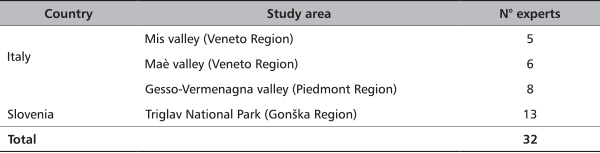 The experts were identified by the researchers of the Recharge.green project and the local partners in a brainstorming session. The major selection criterion was their profe-ssional experience in one of the following sectors: forest management and planning, environment conservation, rural development and renewable energy development. Besides, the experts were chosen on the basis of their expertise and knowledge of the local context. The experts identified in each case study were mainly policy makers and technicians. At the end of this preliminary stage, a total of 32 experts - distributed as illustrated in Table 1 - were identified and directly contacted.