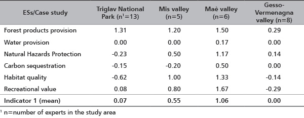 I1 was calculated as the mean value of the experts’ perceived effects of forest biomass harvesting on ESs (Table 5). The effects can be both negative and positive and are strongly influenced by the local context (e.g. presence of protected area, geomorphological and orographic conditions) and the forest management strategies adopted (e.g. silvicultural treatments). Results in Table 5 show that all experts considered positive the effect of forest biomass harvesting on forest products provision (e.g. timber and bioenergy production), with average values ranging from 0.29 in Gesso-Vermenagna valley and 1.50 in Maè valley. Most experts agreed that the removal of woody biomass has negligible effect on the provision of fresh or potable water (average values ranging from 0 to 0.17).