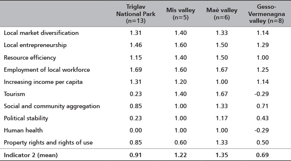 The indicators of social stability (social and community aggregation, political stability) obtained positive values in all case studies, while the experts of the Gesso-Vermenagna valley considered the activity of biomass harvesting as potentially negative on human health (-0.29). The effect of biomass harvesting on the property rights and rights of use was considered positive in all case studies.