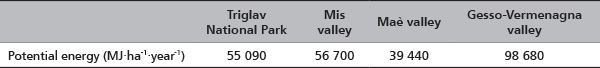 The results of the third indicator (I3) show the potential energy obtained from forest biomass and are presented in Table 7. The differences in the potential energy from case studies are due to the annual increment and to the characteristics of tree species (wood density and energy content). Gesso-Vermenagna valley present the highest values of annual increment and many species with a high calorific value and wood density (e.g. European beech) form a significant part of the growing stock. On the other side, the low values of annual potential energy in Maè valley are mainly due to the high percentage of softwood species (Norway spruce and dwarf mountain pine).
