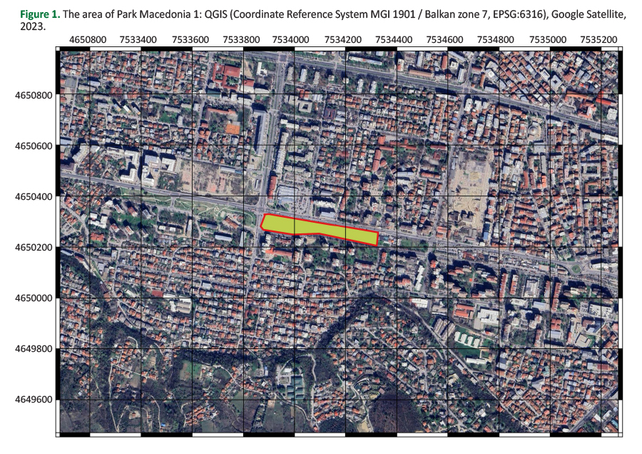 The subject of research in this paper is the urban planning and landscape design of Park Macedonia 1, which is located in the municipality of Karposh, the settlement of Kapishtec, in the city of Skopje, North Macedonia. Park Macedonia 1 covers approximately 25 000 m², bordered to the north by Metropolit Teodosij Golaganov Boulevard and to the south by Jurij Gagarin Street. Established in 2012, the park has undergone enhancements over the years, including the addition of a cycling track for children in 2016 and various plantings adding up to the present vegetation. Given the densely developed nature of the Kapishtec settlement and the scarcity of large parks in the area, Park Macedonia 1 holds significant importance for the local community (Figure 1).