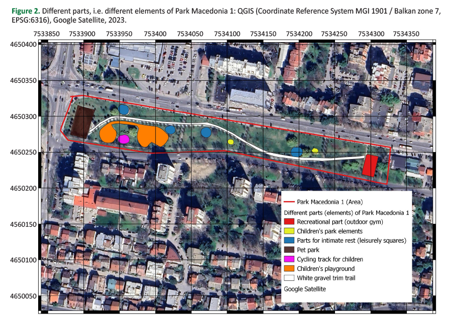 Park Macedonia 1 is one of the newly established urban parks in Skopje, composed of different elements or different parts, i.e. a recreational part with outdoor gym, several children’s park elements, parts for intimate rest, a cycling track for children, a children’s playground, a pet park and a white gravel trim trail (Figure 2). Each part offers different activities.