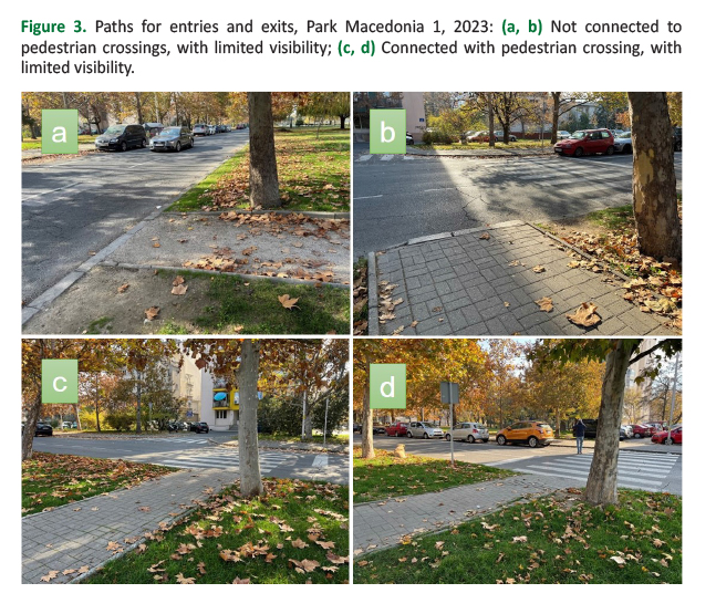 In the south, where the park borders Jurij Gagarin Street, there are four paths to enter and exit the park. There is no pedestrian promenade on this side, and the park directly borders the street. Two of the four paths, which are not connected to pedestrian crossings, are not safe for pedestrians at all (Figure 3a, Figure 3b). Also, there is no full visibility for the pedestrians when crossing the street, due to the position of the trees along the paths (Figure 3).