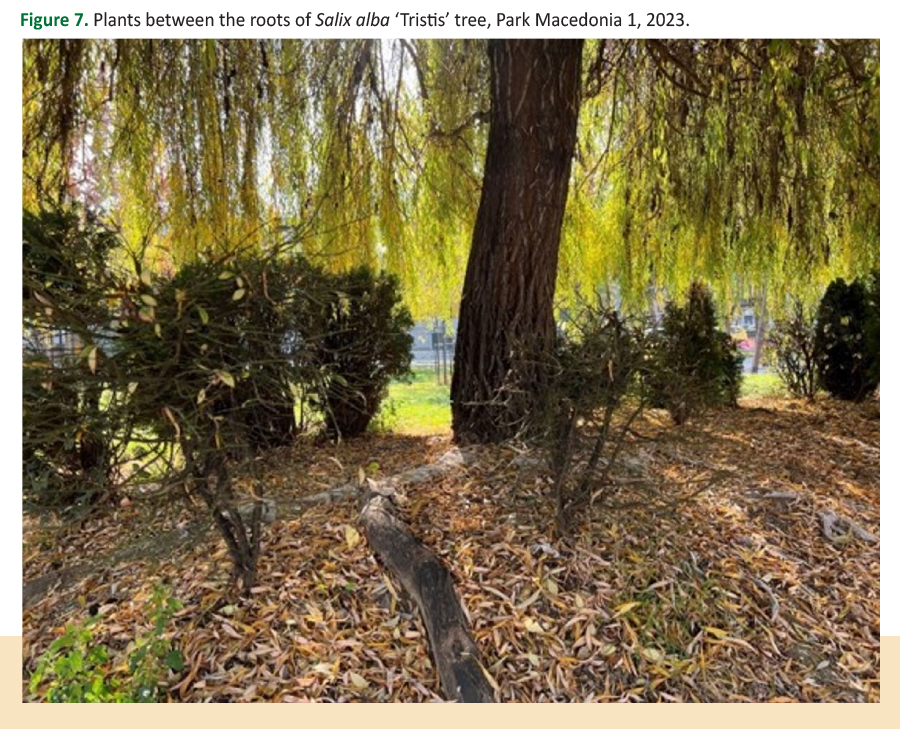 In Park Macedonia 1 there are 225 roses (Rosa Floribunda Group). For their proper growth, they need full sunlight, but only a small number are planted in a sufficiently sunny location. Most of them are planted under the canopy of trees. Almost all are in bad condition, and some are completely dead. Also, there are plants planted between the roots of a large Salix alba ‘Tristis’ tree (Figure 7), which do not have the conditions for proper growth from several aspects, such as the space required for growth and development of the root system, and sufficient sunlight for some of the plant species.