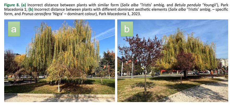 It is also impermissible to have an incorrect distance between plants. This is the result of improper planning and planting. Landscape designers should give trees their space (Figure 8) and should not mix similar or the same forms too close one to another (Figure 8a). In that way plants do not have ideal conditions for proper growth, but also the aesthetic value of each plant decreases and the aesthetic effect of the whole landscape is reduced.