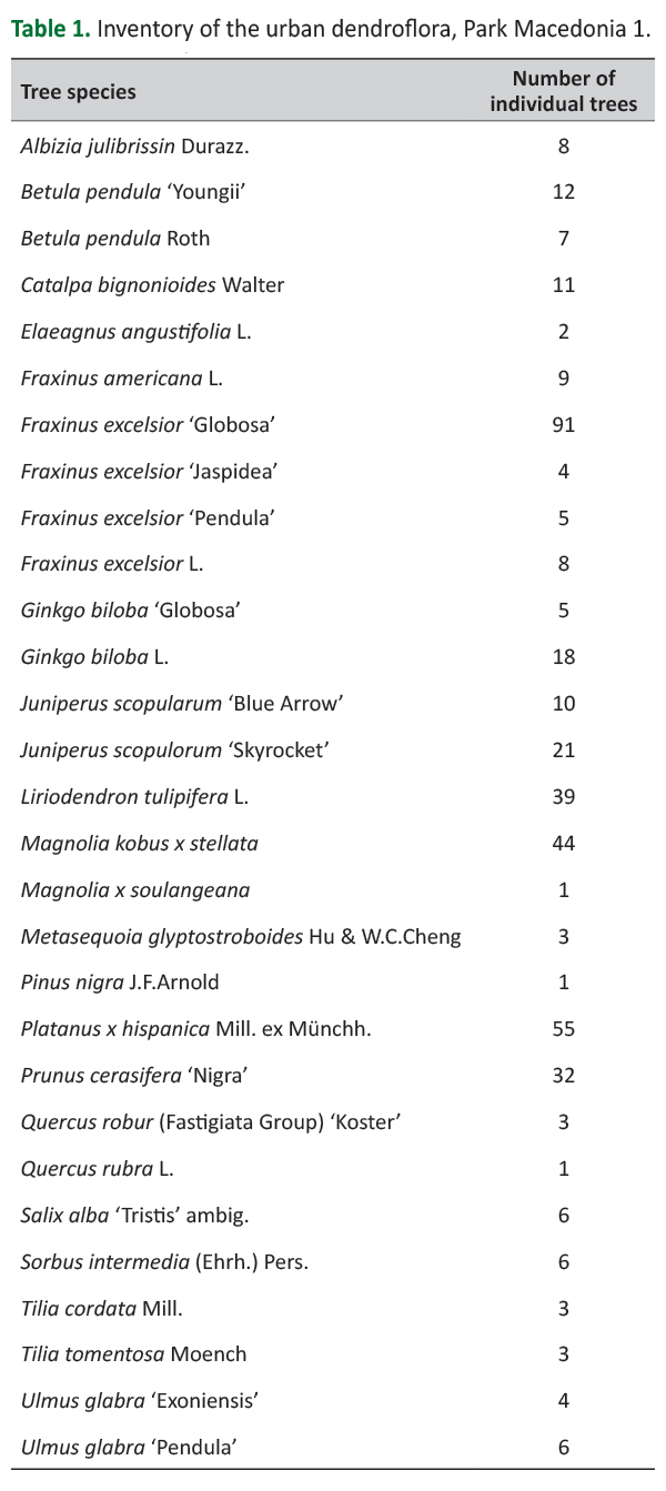 Table 1. Inventory of the urban dendroflora, Park Macedonia 1.