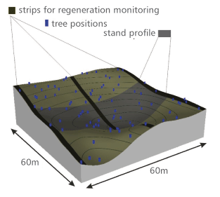 Today, information on stand structure (spatial arrangement of trees, tree measurements, and particularly crown measurements) may be visually presented by means of one of numerous computer programmes. On the basis of a digital model of tree-crown projections, measured values in the field (tree heights, stem length, length and width of crowns) and standard bases, a three-dimensional photo-realistic digital model of a stand was produced. In the production of the model the spatial arrangement of trees and phenotype of crown forms were taken into account [18]. In this investigation stand structure is visualized in the programme packet EnVision (USDA Forest Service, USA) which is shown in Figure 7.