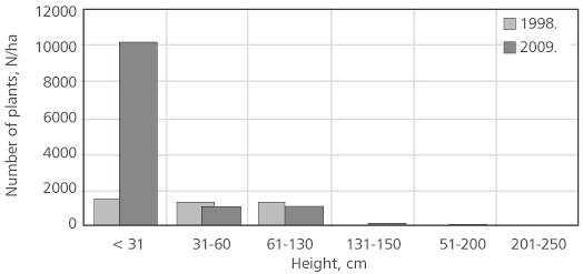 The greatest changes occurred in the share of beech seedlings, the number of which increased fourfold from 3,556 plants per hectare in 1998 to 12,694 plants per hectare in the second measuring. In the percentage share common beech increased from 8.7% to 22.6% of all plants of young growth and shrubs, and took a dominant role among the young crop of trees. With regard to the height structure of the young beech trees, their increased number is most visible in height class up to 30 cm (Figure 6). The majority of the young beech plants is of poor quality and it is questionable how they will continue their further development in the conditions of passive protection.