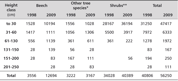 As has already been stated that the process of natural regeneration was mainly influenced by the opening of the canopy due to the die-back of one dominant beech tree and by development of advanced regeneration (Figure 5). The area of the advanced regeneration in 1998 amounted to 124.7 m2 which increased fourfold in the second measurement, to 512.2 m2. By measuring the numbers of the regeneration and shrubs on three strips (Figure 2) on total area of 360 m2 in 1998 and 2009, an increase in the overall number of plants from 40.8 to 56.2 plants per hectare, was determined (Table 2).