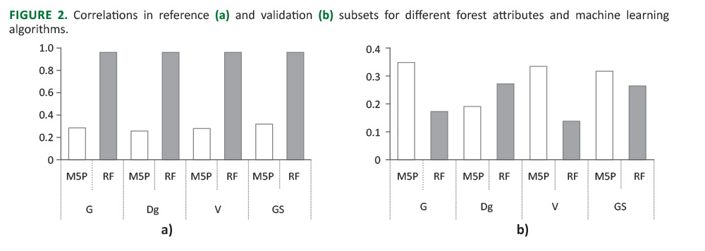 The RF performed better in a reference set for all forest attributes related to correlations between the observed and predicted values, while correlations in validation subsets were higher for M5P for all attributes (Figure 2).