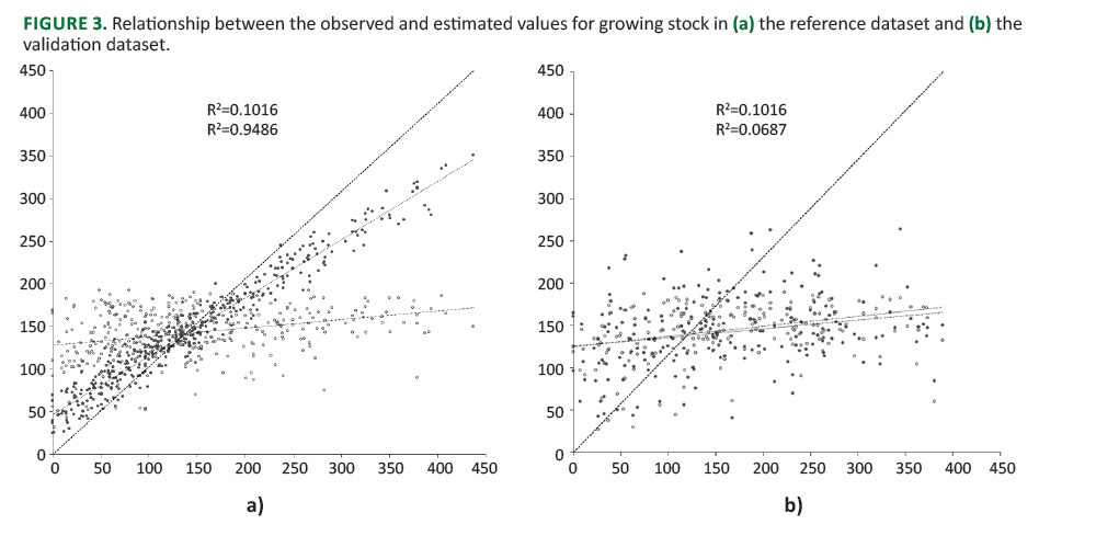 where yi is observed forest attribute of the data i, ŷi is estimated forest attribute of i, n is the number of validation data and y⁻ is the mean of the observed forest attribute. Then, determination was used to examine relationships between observed and estimated values.