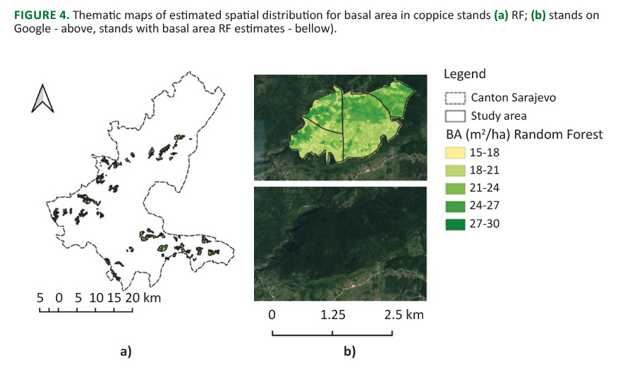 Here is a visualized spatial distribution modelled by RF for basal area as an example and two details with stands from Google Satellite (above) and estimated basal area (below) (Figure 4).
