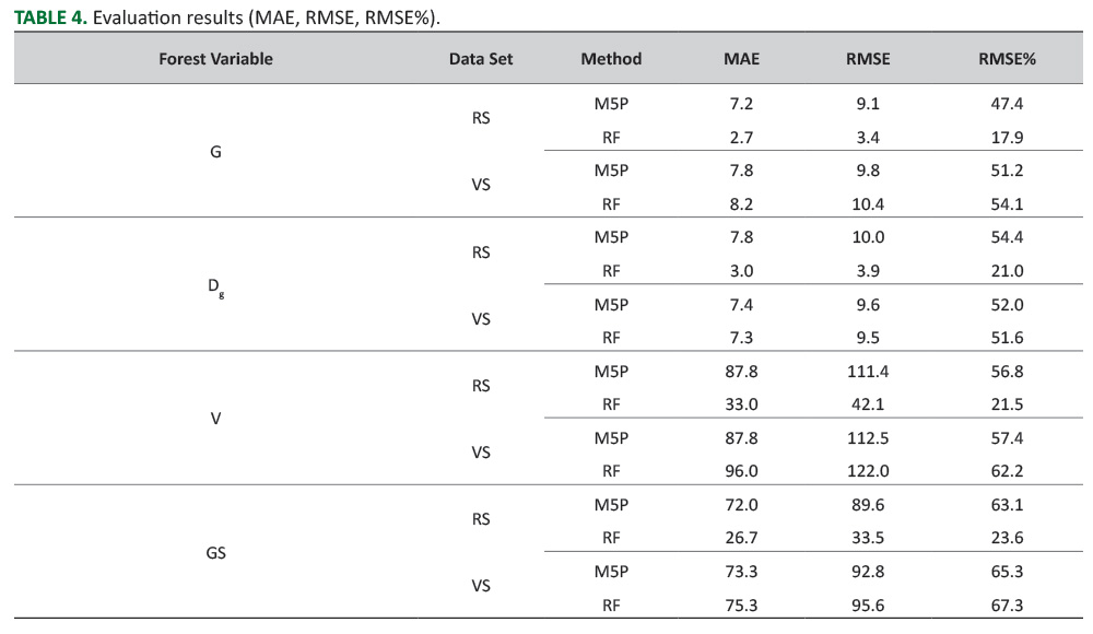 - Machine learning modelling based on M5P and RF resulted in different efficiency for all forest attributes. RF estimates in reference sets (RMSE% below 24%) were better than M5P estimates (RMSE% below 63%). In both modelling processes over fitting in reference sets were obtained, while estimates achieved high relative RMSEs in validation sets.
