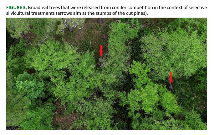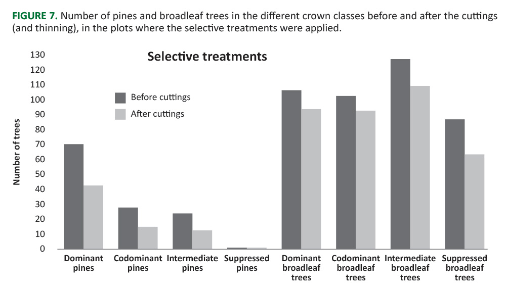 The so-called selective treatments include rather intense cuttings in the overstory of pines (conifers) and thinning in the broadleaf component of the lower stories.