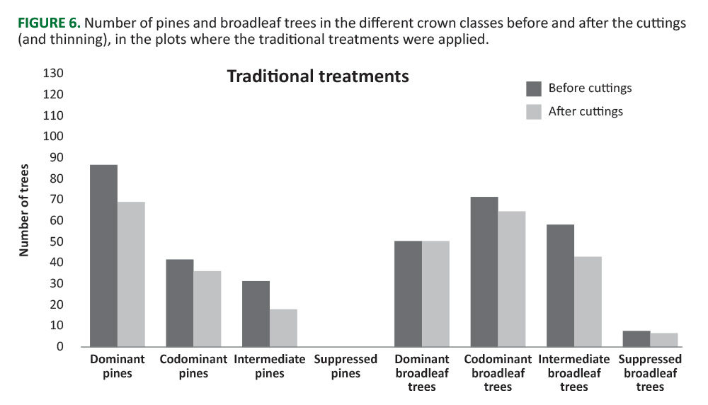 Results: In the established plots, before the cuttings (and thinning), total basal area was not statistically significantly different between the two types of treatments. In selective treatments, the basal area of all cut trees was statistically significantly higher than that of the results of traditional treatments. In the broadleaf cut trees there were statistical differences in the ratios of dominant, intermediate and suppressed trees between the two silvicultural approaches.
