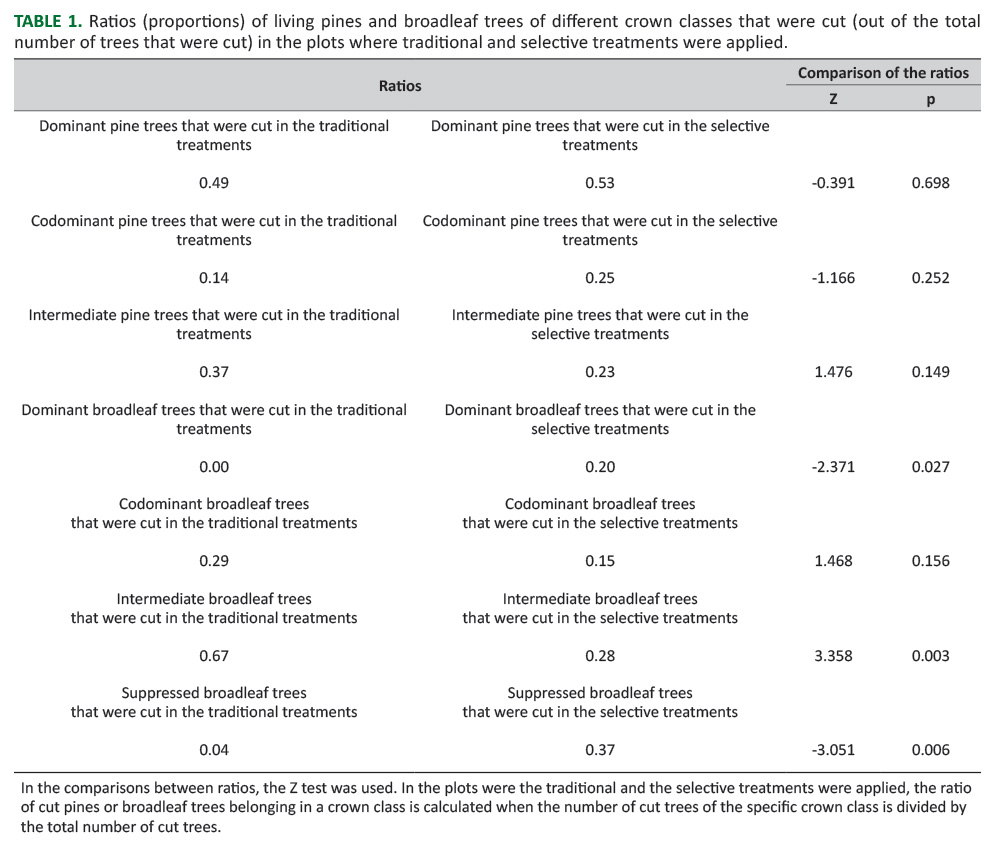 In the plots where the traditional and the selective treatments were applied, the ratio (proportion) of cut pines or broadleaf trees belonging in a crown class is calculated when the number of cut trees of the specific crown class is divided by the total number of cut trees. In the comparisons between ratios, the Z test was used [21], while in the comparisons between basal areas the t test was used.