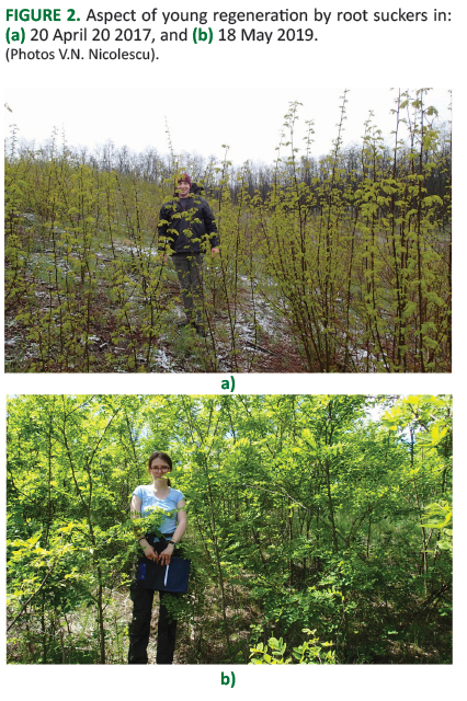 In the context of these characteristics of black locust stands and silviculture in the early stages, a Research and Development (R&D) project was launched in 2016, in order to evaluate the regeneration and early tending of black locust stands in the north-west of Romania. The objectives of this project are (1) to assess the regeneration potential of black locust by root suckers, (2) to assess the early growth of root sucker stems, and (3) to follow and evaluate the early results of these interventions in terms of quality, growth and yield of young black locust stands.