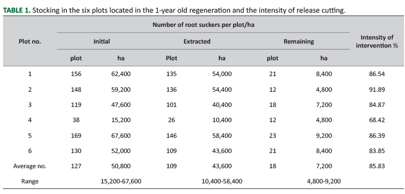 This very high stocking allowed for very heavy interventions (over 25% of the number of trees [40]) with release cutting (from 68.42% to 91.89%, over 80% in the majority of plots), reducing the stocking per ha to between 4,800 suckers and 9,200 suckers (7,200 suckers on average) (Table 1).