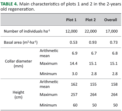 TABLE 4. Main characteristics of plots 1 and 2 in the 2-years old regeneration.}