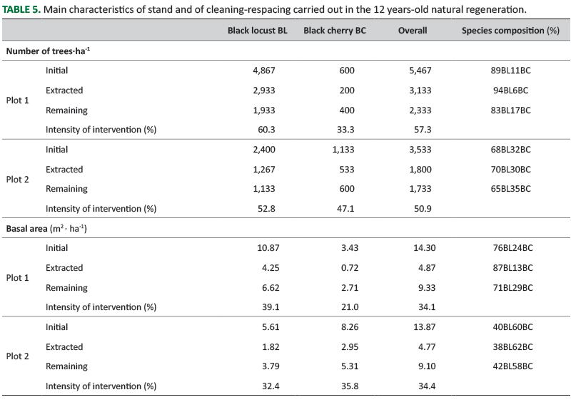 The stand initial stocking was very high (5,467 trees·ha-1) in plot 1, and lower (3,533 trees·ha-1) in plot 2. These trees had a similar basal area (14.30 m2·ha-1 in plot 1 and 13.87 m2·ha-1 in plot 2). This made a very heavy intervention possible, with the removal of over 25% trees, reducing the stocking to 2,333 trees·ha-1 and the basal area to 9.33 m2·ha-1 (plot 1) and 1,733 trees·ha-1 and 9.10 m2·ha-1 (plot 2) (Figure 3 and Table 5).