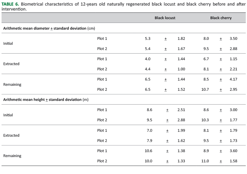 As the intervention removed mostly the smallest (thinnest and shortest) trees, the arithmetic mean diameter and arithmetic mean height increased in both black locust and black cherry, particularly in the former species (Table 6).