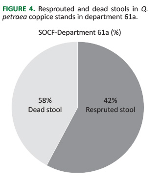 FIGURE 4. Resprouted and dead stools in Q. petraea coppice stands in department 61a.
