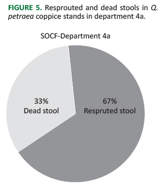 FIGURE 5. Resprouted and dead stools in Q. petraea coppice stands in department 4a.