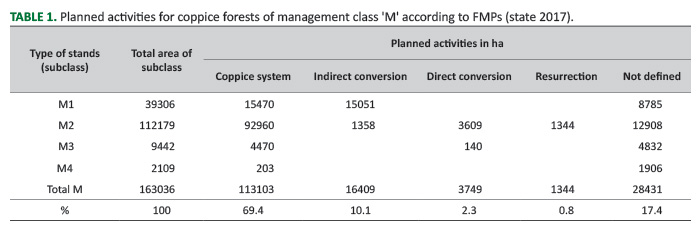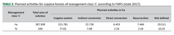 According to our analyses, the total forest cover area which is subject to current FMPs for the entire country is 888,649 ha (state 2017). Of these, Q. petraea coppice forests (QPCF) are classified as management class 'M' and cover an area of 163,036 ha. For QPCF, at the class level, simple coppicing (coppice system & resurrection) is planned to continue on an area of 114,447 ha. On the other hand, the transformation of coppice stands to high forests is planned for 16,409 ha through indirect conversion, while for 3,749 ha through direct conversion with substitution. For 28,432 ha QPCF objectives are not defined, and the often-used term in these cases is "stands at rest" (Table 1). This term is usually applied for low productive oak coppice stands or small areas at the management class level which have been recently coppiced. For those types of stands even the aim of management is not defined, and they are just categorized as management class/subclass in a specific Forest Management Unit (FMU).