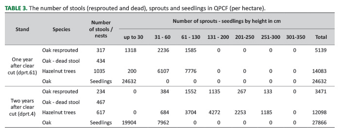 TABLE 4. The number of stools (resprouted and dead), sprouts and seedlings in QFCF (per hectarе).