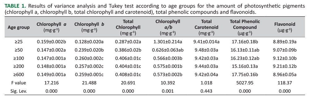 Changes in the amount of photosynthetic pigments, total phenolic compounds and flavonoids in the oriental beech leaves are given in Table 1. According to the variance analysis results, the amounts of chlorophyll a, b, chlorophyll a/b, total chlorophyll, total phenolic compound and flavonoids showed significant differences depending on tree age except total carotenoids (Table 1).