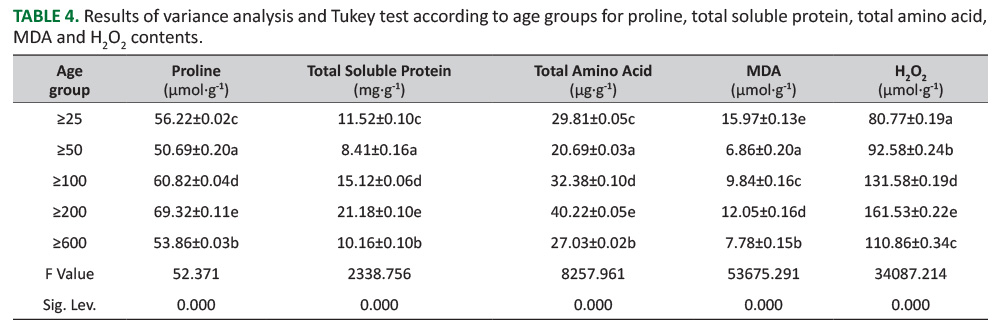 Age-related change of nitrogenous compounds such as proline, total soluble protein, total amino acid and nitrogen (%) in oriental beech trees was found statistically significant. Also, MDA and H2O2 concentrations demonstrated significant age-related differences. H2O2 concentration varied between 80.88 µmol and 161.53 µmol (Table 4).