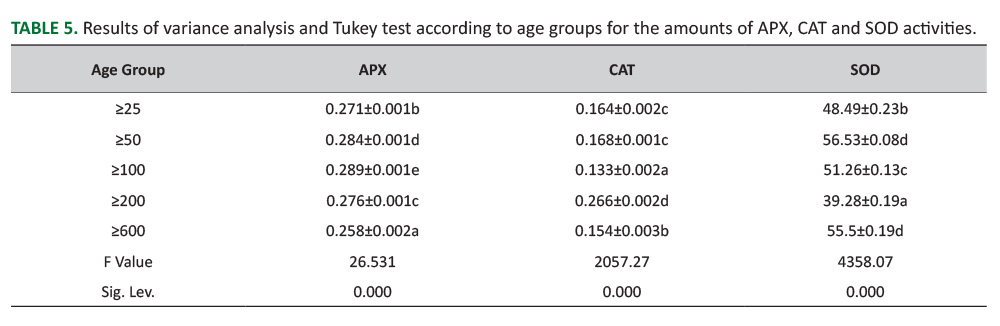 APX, CAT and SOD activities were affected by tree age at a significant level. The APX activity was found to be the lowest in a tree older than 600 years. CAT activity was 72.96% higher in trees older than 200 years compared to ≥600 years-old trees and 13.54% lower in trees older than 100 years. On the other hand, the SOD activity was found to be higher in ≥50 and ≥600 years-old beech trees (Table 5).