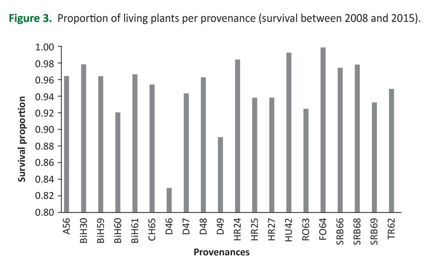 Figure 3. Proportion of living plants per provenance (survival between 2008 and 2015).