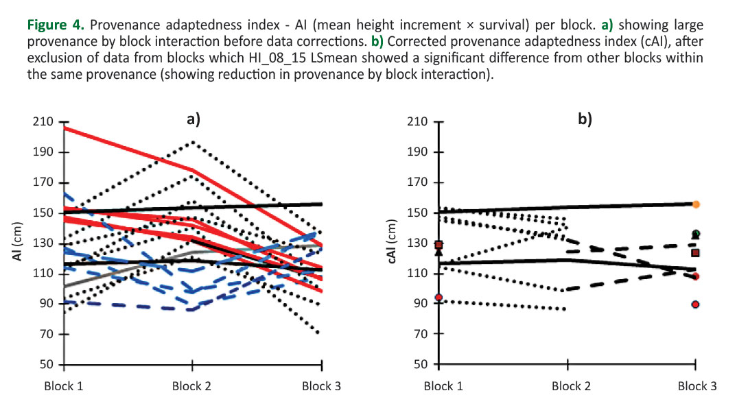 Provenance D46 had the lowest survival (0.83), while provenance RO64 exhibited the highest survival (1.0). However, significant differences in provenance survival were found regarding the blocks. For example, survival of provenance D46 was 0.73 in block 1 but 0.94 in block 2. The product of average provenance height increment and survival (adaptedness index - AI) was an indicator of its productivity, i.e. adaptedness to specific habitat conditions (Ishizuka and Goto 2012). Provenance AIs per block before data corrections are shown in Figure 4a. Significant provenance by block interactions is visualized by pronounced changes in provenance rankings across blocks. Four groups of provenances can be distinguished from Figure 4a: i) provenances that showed the highest mean AI in the first block, while their mean AI decreased towards the 2nd and 3rd blocks (those are indicated by the solid red lines in Figure 4a); ii) provenances that had similar (lower) mean AI values at blocks 1 and 3, while highest mean AI at block 2 (those are indicated by dotted black lines - Figure 4a); iii) provenances that had similar (higher) mean AI values at blocks 1 and 3 while lowest mean AI at block 2 (those are indicated by dashed blue lines - Figure 4a); iv) stable provenances whose mean AI values were similar at all three blocks (indicated by the solid black lines - Figure 4a). Provenance BH61 stands out specific to all others because its mean AI value was lowest at blocks 1 and increased towards blocks 2 and 3 (indicated by a solid gray line - Figure 4a). We tried to reduce the effect of provenance by block interaction by excluding data from the blocks whose LSmeans (of HI08_15) were significantly different from the others. Two provenances were completely excluded from further analyses (A56 and HR24) because their LSmeans differed significantly among all three blocks. By this procedure, we significantly reduced the variation of a provenance AI at the trial (i.e. microsite effects on calculations of overall provenance mean AI were reduced) (Figure 4b).