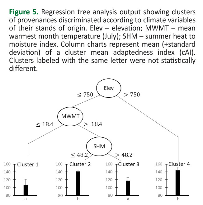 Provenance mean height increment multiplied with survival was used as a measure of a provenance’s adaptedness (i.e. adaptedness index – AI, Ishizuka and Goto 2012) to the trial site conditions. Regression tree (RT) analysis was used to determine the pattern of among-provenance variation for AI, using the Orange Tree Widget (Demšar et al. 2013). A set of clusters was grown by repeated binary splits of the provenances. Splits were made using environmental predictor variables as criteria, so that the homogeneity of genetic response variable (i.e., the provenance mean AI) is maximized. No assumptions were made about the mathematical nature of the relationship between response and predictor variables. Various climatic variables related to the provenance stands of origin were used as environmental predictor variables. To characterize the long-term climate conditions at the provenances stands of origin, we used interpolated climate data for the 1981-2009 reference period that was generated with the ClimateEU software (Hamann A, Wang T, Spittlehouse DL, Murdock TQ, 2013; ClimateEU, unpublished software package for Europe freely available at http://www.ualberta.ca/~ahamann/ data/climateeu.html). Estimation of biologically relevant climate variables, lapse-rate elevation adjustments, and data extraction from grids for the sample locations were carried out with the ClimateEU software, as well. A detailed explanation of the estimation of all available climate variables given by the ClimateEU software can be found in Wang et al. (2011). Significance of difference among the clusters given by RT analyses was calculated with Tukey HSD test.