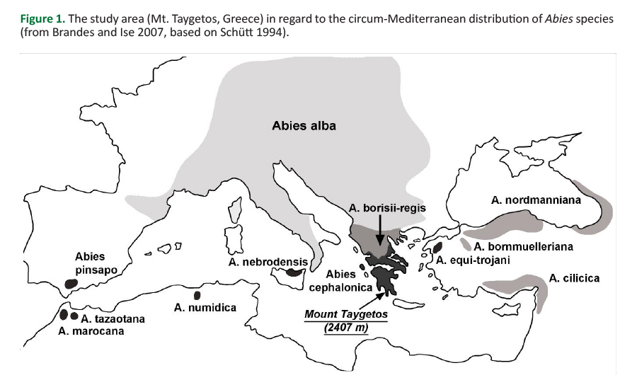 The present study deals with the fir and pine/fir forests of the oromediterranean altitudinal zone (ca. 900-2000 m a.s.l.) on the Hellenic peninsula. They are of great ecological and economic importance, representing one of the most important forest types in Greece. Their existence depends on climate-ecological conditions differing from the lowlands by higher precipitation and lower temperatures (Efthimiou et al. 2014). Any climatic impacts changing these favorable hygric conditions would have negative ecological consequences on the mountain forests, especially in combination with land-use changes, leading to the accumulation of fuel for wildfires (Sarris et al. 2014). The aim of the current study is to give a synoptical, wide-angle view on the situation of the genus Abies in the Mediterranean and more precisely on the oromediterranean forests of the southern Peloponnese, at Mt. Taygetos, based on the results from earlier studies (Block and Brandes 2001, Brandes 2007, 2008, 2009, Brandes and Ise 2007). In addition, more recent ecological and forestry studies conducted after the 2007 wildfire were taken into account (Arianoutsou et al. 2010, Christopoulou et al. 2013, 2014, 2019, Sarris et al. 2014).