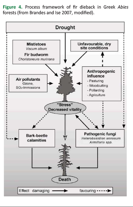 Fir dieback, the second driving force of the mosaic cycle, is a slow process caused by various factors (e.g. climate, air pollution, pathogenic fungi), out of which drought plays the key role. Indeed, a close temporal and causal connection between drought years and wide-spread fir dieback has been documented in fir stands of various regions in Greece for several years of the 20th century and also in 2001 and 2002 (Markalas 1992, Brofas and Economidou 1994, Raftoyannis and Spanos 2015). The lack of water causes stress to the trees and thus favors the attack of various biotic factors. Figure 4 shows the complex process framework of the fir dieback (Brandes and Ise 2007).