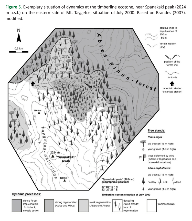 This type of oromediterranean coniferous forest, as we find it on Mt. Taygetos, exists also in the other mountain areas of the Peloponnese (Horvat et al. 1974, Brandes 2007). Therefore, conclusions from this contribution are not only meaningful for Mt. Taygetos, but for the whole Peloponnese, as well as for fir/black pine forests in central and western Greece in general.