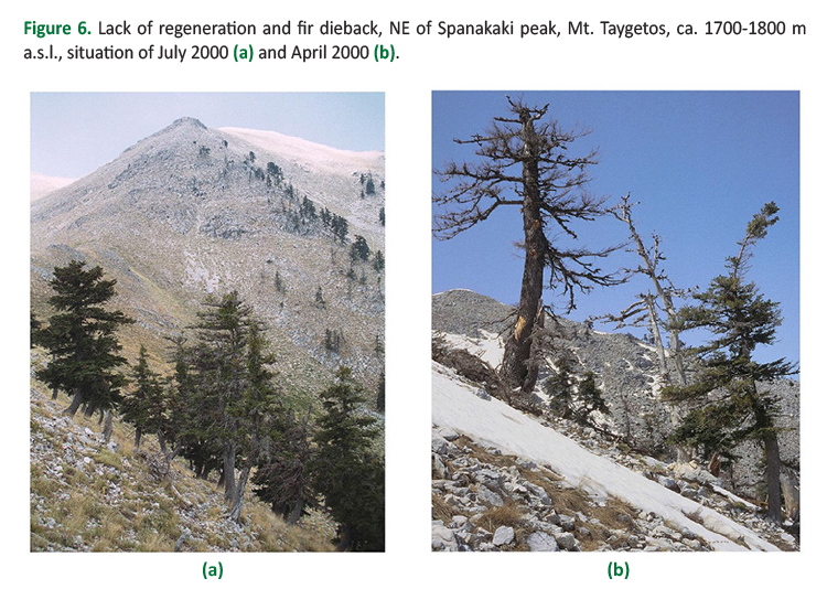 The oromediterranean forests of Greece, particularly where formed purely by Abies, are not (well) adapted to fires, especially in cases of severe or high-intensity fires. The wildfires of the year 2007, which were connected to exceptional drought and heatwaves, have revealed this clearly. Moreover, the drought-related process framework of fir dieback presents a threat to the existence of fir forests in Greece. Eventually, the regressive timberline dynamics are an indication that in recent decades drought has caused the decay of older firs and also prevented regeneration on dry, rocky sites. All this fits to the expectation that climatically induced effects on vegetation will become visible first at the ecological boundary of a certain species (i.e. at the margin of geographical distribution or at ecotones).