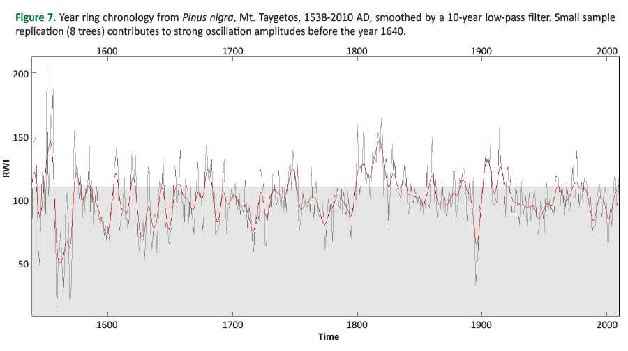 Dendrochronological research carried out on P. nigra in Mt. Taygetos (sampled on 1400-1700 m a.s.l.) provided the data for tree-ring width chronologies of this area (Brandes 2007, 2009). Figure 7 shows a 472 years chronology going back to 1538 AD, together with a 10-year low-pass filter. The figure was made by R using the dplr package (Bunn et al. 2019). Statistically revealed climate-growth relations indicated that the precipitation during the growing season (first of all in May/June) has the strongest influence on the tree-ring width of black pines of Taygetos (Brandes 2007, 2009). Similarly, Fyllas et al. (2017) found that the growth of both A. cephalonica and P. nigra at Mt. Taygetos was positively correlated with May precipitation.