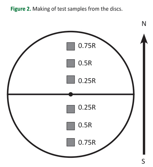 The discs were divided into halves as 'north' and 'south' parts. From each of them test samples were made in the form of rectangular prisms 20×20×30 mm at a distance of 0.25R, 0.5R and 0.75R from the pith (Figure 2).
