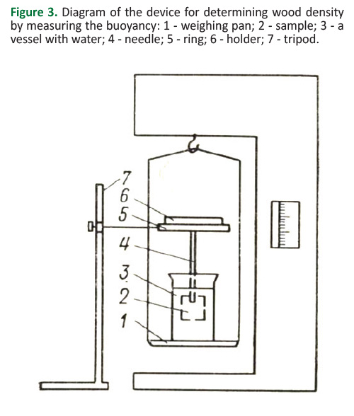 To determine the basic density by Equation 1 the method based on measuring the buoyancy force of the samples immersed in liquid was used. A detailed description of this method is presented below (Figure 3).