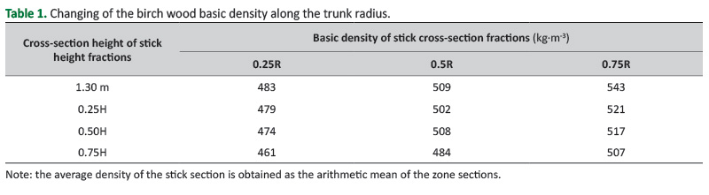 Table 1. Changing of the birch wood basic density along the trunk radius.