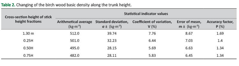 Table 2.Changing of the birch wood basic density along the trunk height.