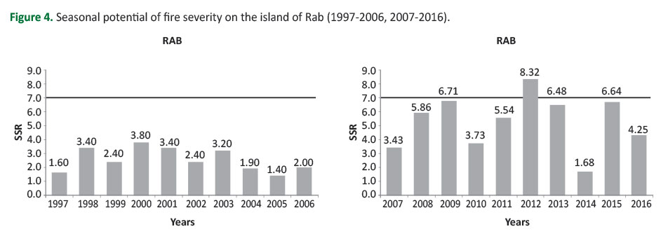 Figure 4. Seasonal potential of fire severity on the island of Rab (1997-2006, 2007-2016).