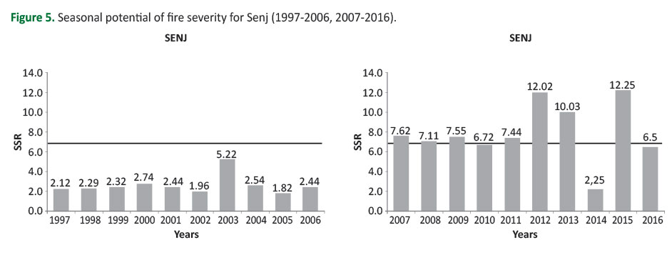 Seasonal potential of fire severity indicates an increase in severity between 2007 and 2013, which is contrast to the researched period from 1997 to 2006, where the limit value of 7 is not exceeded. For Senj and Pazin, the values for 2012, 2013 and 2015 are extremely high, unlike values for Rijeka, Rab and Poreč, where only in 2012 the severity of fires exceeds the reference value of 7 (obtained by applying the Canadian method of the Meteorological Index of Forest Fire Hazards (Vučetić 2000), according to the results by Williams and Van Wagner in Dimitrov (1998). The decisive reason might be several days with strong winds in the circumstances of extremely dry and hot summer.
