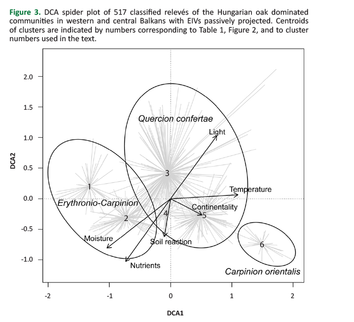 Classification is backed by the DCA ordination plot (Figure 3), where EIVs for temperature, moisture, light and nutrients are significantly related to the first two DCA axes (P<=0.001; Table 2). The main ecological factors influencing the variation in the floristic composition are EIVs for temperature (positively correlated to the first axis) and moisture (negatively correlated with the first axis), suggesting that the first axis represents the macro-climatic gradient that runs from mesophilous forests of Erythronio-Carpinion (left side of the diagram) to xerothermophilous forests of Quercion confertae (center of the diagram) and Carpinion orientalis (right side of the diagram).