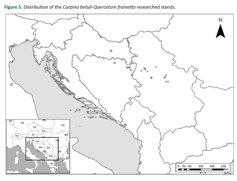 Hungarian oak (Quercus frainetto) is a subendemic south European tree species with a relatively small distribution area that is confined to central, eastern and southern Balkans from where it extends to western Anatolia, western Balkans (Bosnia and Herzegovina, hereafter B&H, Montenegro and Croatia), western Romania and eastern Hungary, with a disjunction in Italy. It either functions as the main or a subordinated element of xero-thermophilous forests of Quercetalia pubescenti-petraeae (Jovanović et al. 1986, Stefanović 1988, Kojić et al. 1998, Bergmeier and Dimopoulos 2008, Borhidi et al. 2012, Vukelić 2012, Tomić and Rakonjac 2013, Indreica 2015, Škvorc et al. 2017, Di Pietro et al. 2019, Tzonev et al. 2019). In the Balkan part of the distribution area, its communities are mainly assigned to Quercion confertae, with a few communities from Bulgaria classified in Quercion petraeo-cerridis (Tzonev et al. 2019). It is also traditionally accepted that it builds a zonal vegetation in lowland and hilly regions with the dryer sub-continental climate of central Balkans (Horvat et al. 1974).